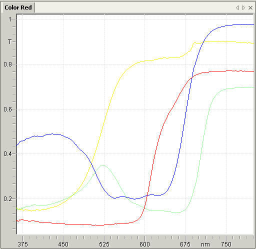 In der folgenden 2D-Beispielansicht sind die UV/VIS Spektren der Farben Rot, Grün, Blau und Gelb in einer Datenansicht verschmolzen.