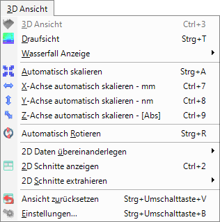 Das Menü "3D-Ansicht" enthält diverse Befehle um das Darstellungsfeld der 3D-Datenansicht anzupassen. Der Benutzer kann 3D-Daten zoomen, skalieren, verschieben und scrollen um diese für den Druck vorzubereiten oder um weitere Auswertungen durchzuführen.