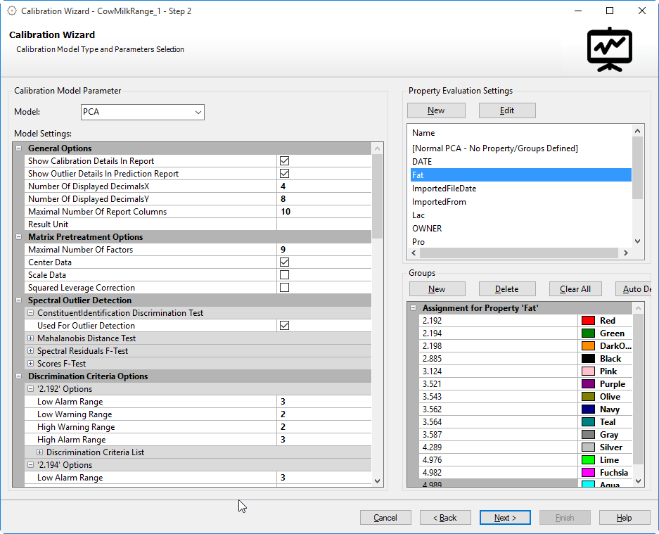 Im Falle der PCA-Kalibrierung bestehen zwei Optionen zur Wahl der auszuwertenden Eigenschaften. Zusätzlich ist eine Auswahl/Eingabe von Gruppen möglich (siehe unten):