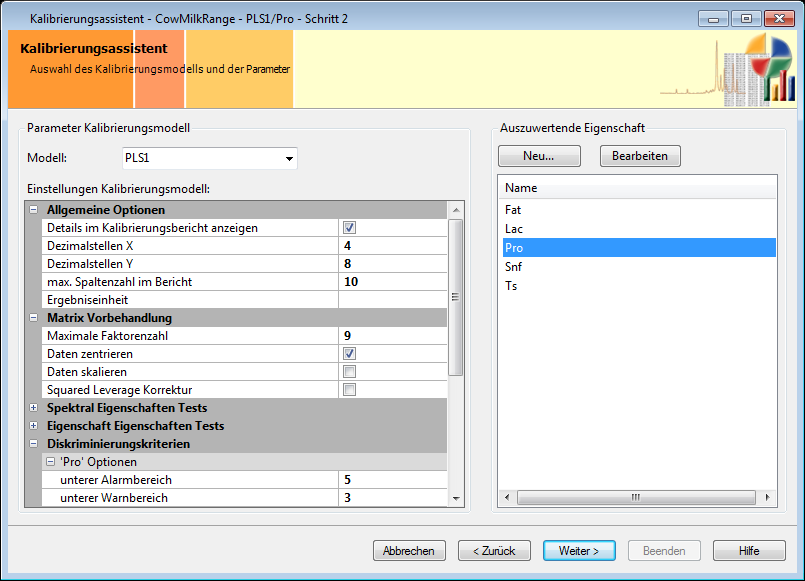 In diesem Schritt muss ein passendes Kalibrierungsmodell und die zu kalibrierenden Eigenschaften (eine oder mehrere) ausgewählt werden. Einige spezielle Kalibrierungs-Parameter können zusätzlich eingestellt werden.