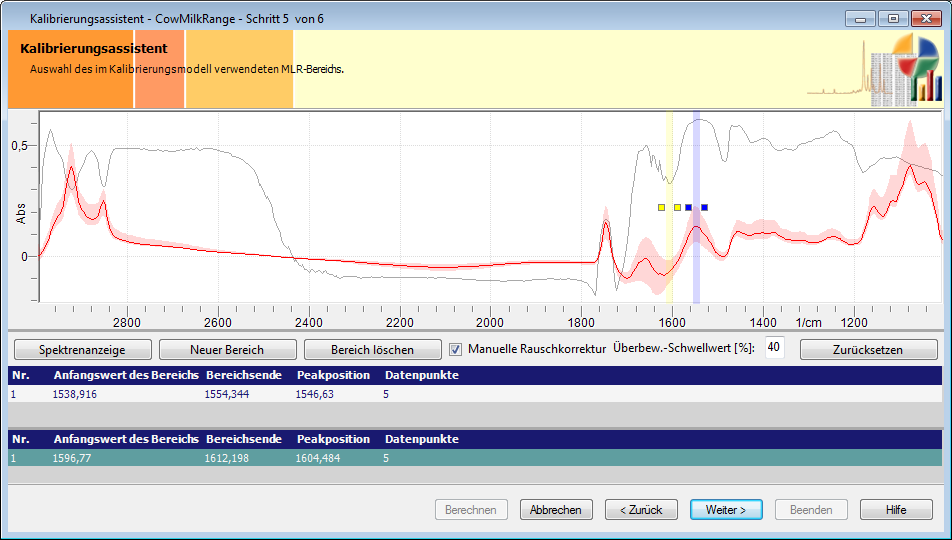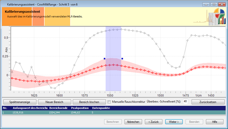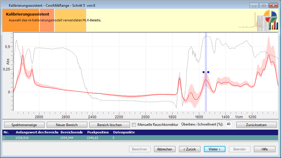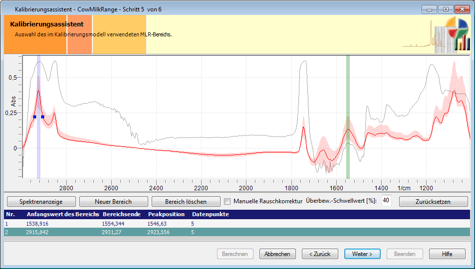 Die Auswahl der signifikanten Spektrenbereiche stellt den schwierigsten Schritt einer Kalibrierung dar. Benutzer wählen häufig zu viele Spektrenbereiche und dies verringert folglich die Qualität des resultierenden Modells. Der Assistent unterstützt den Benutzer daher bei der Wahl des optimalen Spektrenbereichs und der Erstellung eines guten Modells.