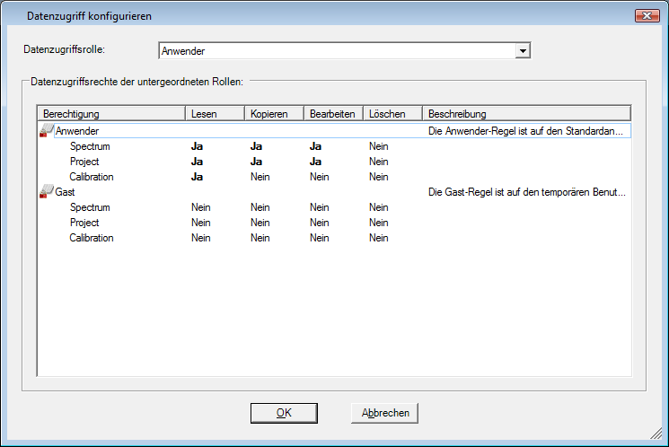 Solange die höchste Signatur eines Objekts die Anwender-Rolle ist, darf dieser Benutzer Spektren und Projekte modifizieren bzw. kopieren. Wird das Objekt allerdings mit einer übergeordneten Rolle signiert, können diese Rechte widerrufen werden - wie beispielsweise im ersten Bild zu sehen ist. Dieses System repräsentiert sowohl den allgemeinen ArbeitsfluÄ, der häufig von "unten nach oben" abläuft (z.B.: der Anwender nimmt ein Spektrum auf und gibt es an den Chemiker/Supervisor weiter), also auch die klassische Hierarchie die von oben nach unten verläuft.