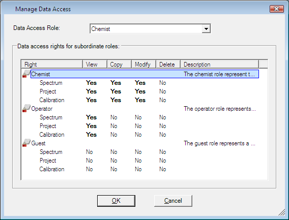 Dieses Fenster zeigt die Zugriffsrechte der gewählten Rolle und aller untergeordneten Rollen. Die Datenzugriffsrechte bezüglich der Spektren, Projekte und Kalibrierungen können separat bearbeitet werden. Verfügbare Zugriffsrechte sind Lesen, Kopieren, Bearbeiten und Löschen:
