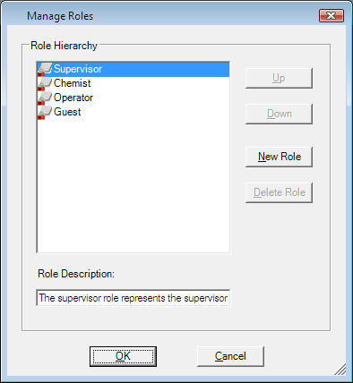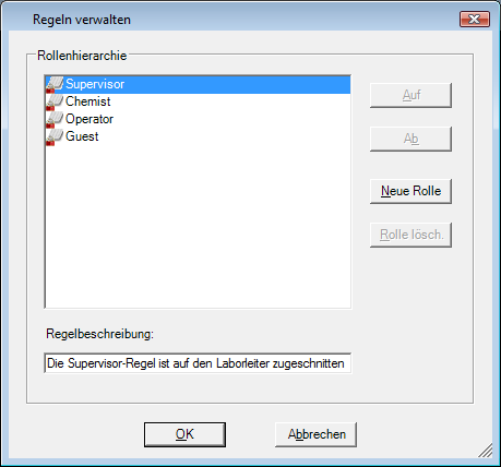 Der Dialog zeigt alle vorhandenen Rollen in der aktuellen Hierarchie an. Die Hierarchie kann mit Hilfe der Auf/Ab-Buttons bearbeitet und Rollen können hinzugefügt und gelöscht werden: