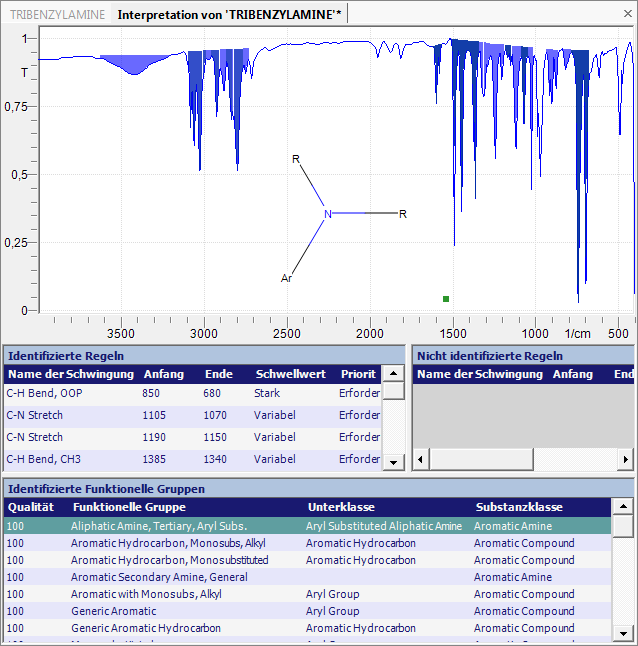 Die Funktion "Alle identifizierten Funktionellen Gruppen anzeigen" ermöglicht einen schnellen Überblick über alle in der aktuellen IR/Raman-Interpretation zur Zuordnung der funktionellen Gruppen verwendeten Banden. Somit lassen sich die zugewiesenen und noch nicht zugewiesenen Banden schnell erkennen und ermöglichen eine weitere Optimierung oder eine zusätzliche manuelle Interpretation.