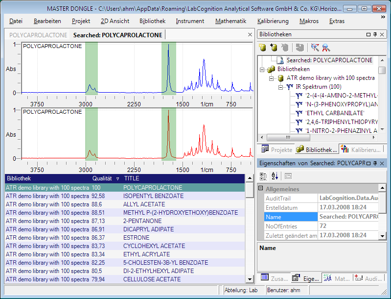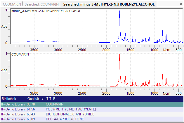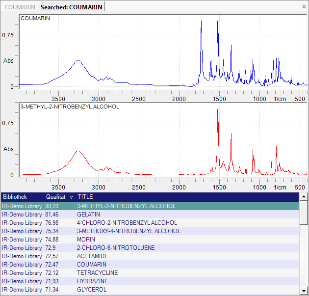 Das Suchspektrum wird oben im Fenster angezeigt, das Spektrum des gerade ausgewählten Suchtreffers befindet sich direkt darunter und ermöglicht so den schnellen Vergleich.