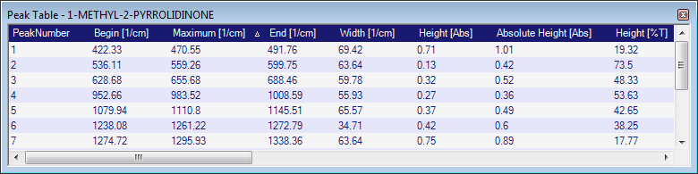 Alle allgemeinen Funktionen die in der Software mit Tabellen durchgeführt werden können sind auch mit der Peaktabelle möglich. Die Tabelle an sich kann jedoch nicht modifiziert werden.