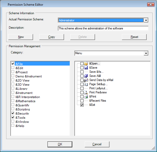 In diesem Bereich werden die einzelnen Rechte des gewählten Schemas angezeigt. Alle Funktionen der Software werden über eine Menü- und Befehlsauflistung dargestellt. Einzelne Zugriffsrechte werden einfach durch aktivieren/deaktivieren der entsprechenden Checkbox gewährt bzw. aufgehoben.