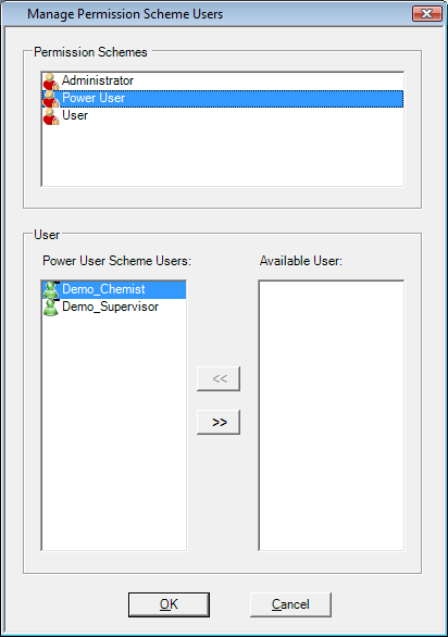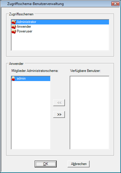 Zeigt alle Benutzer die momentan keinem Zugriffsschema zugewiesen sind. Benutzer müssen mittels des Buttonsvon ihrem bisherigen Zugriffsschema getrennt werden um in dieser Liste verfügbar zu sein. Alle Benutzer in dieser Liste müssen einem Schema zugewiesen werden bevor der Dialog geschlossen werden kann. Wählen Sie ein geeignetes Schema und ordnen Sie den Benutzer durch Klick auf den Button