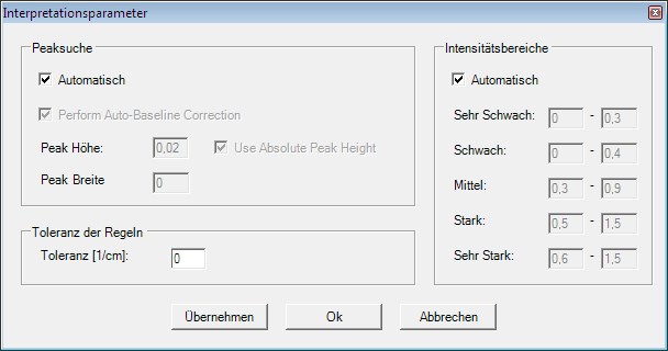 Die Zahlenwerte in den Eingabefeldern der jeweiligen qualitativen Intensitätskategorie geben die zu erwartenden Intensitätsbereiche in Absorptionseinheiten an und ermöglichen so die Klassifizierung eines Signals als sehr schwach, schwach, mittel, stark oder sehr stark. Peaks deren Intensität mit einem der Bereiche übereinstimmt werden so identifiziert. Intensitätswerte könne zwischen 0 und 1.5 Absorptionseinheiten eingegeben werden und die Bereiche einzelner Kategorien dürfen sich überlappen.