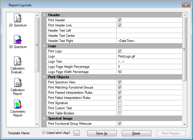 Wird der Dialog Druckvorlage aufgerufen wenn ein Datenobjekt in der Datenansicht geöffnet ist, dann wird der Button Seitenansicht (Druckvorschau) für die entsprechende Druckvorlage aktiviert. Der Benutzer kann die vorgenommen Ąnderungen so direkt im Dialog Druckvorschau überprüfen. Zum Beispiel: Wird der Dialog Drucklayout bei einem geöffnetem 2D Spektrum aufgerufen, so ist der Button Seitenansicht für die 2D-Spektren Druckvorlage aktiviert. Das geöffnete Spektrum lässt sich so, formatiert entsprechend der Vorlage, in der Druckvorschau betrachten.