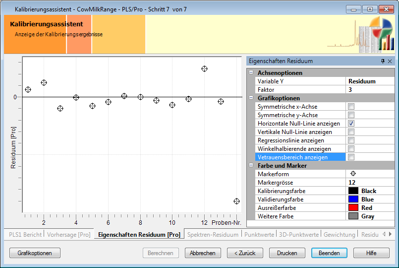 Der Residuum Plot ist eine grafische Darstellung der jeweiligen Restwerte pro Probe. Die Grafik zeigt die Differenz zwischen tatsächlichem Eigenschaftswert und vorhergesagtem Eigenschaftswert.