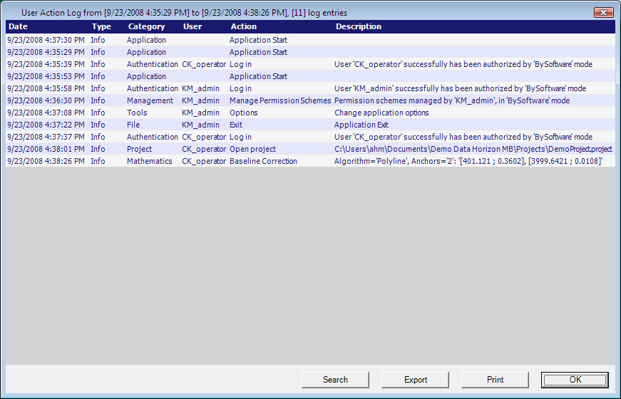 Der Befehl "Aktuelles Aktivitätslog anzeigen" öffnet ein Fenster mit den Einträgen des aktuellen Aktivitätslogs. Das Aktivitätslog zeichnet alle Aktionen auf die von den Benutzern in der Anwendung durchgeführt werden. Der Befehl ist nur verfügbar wenn die Aktivitätsprotokollierung in den Sicherheitseinstellungen aktiviert ist. Die Logdatei kann gedruckt, exportiert oder auch durchsucht werden.