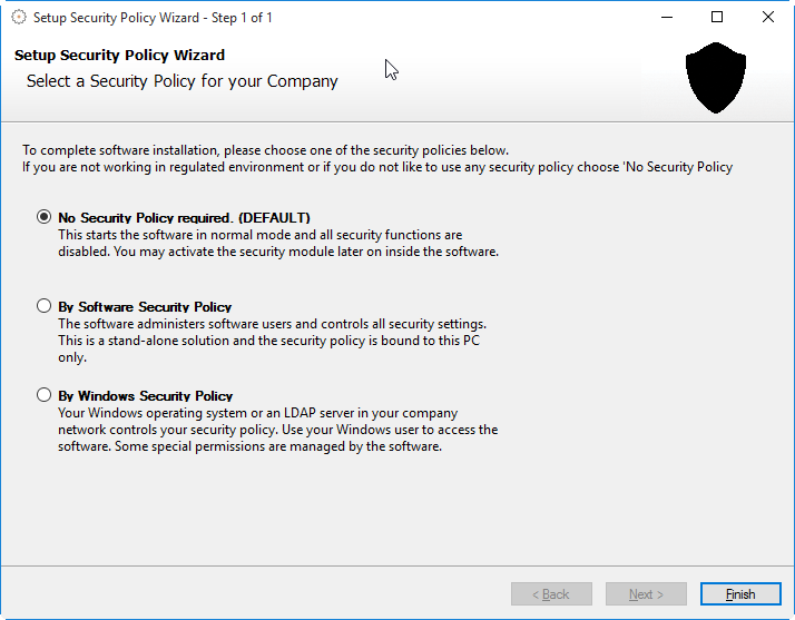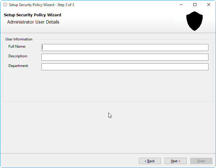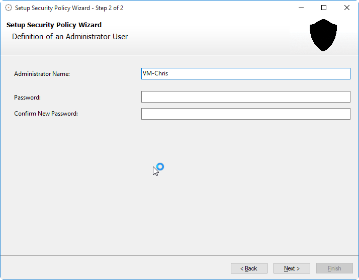 Dieser Assistent unterstützt den Anwender bei der Einrichtung der Sicherheitsrichtlinie und des Administrators. Bei Verwendung dieser Sicherheitsrichtlinie werden alle Benutzer von der Software selbst verwaltet.