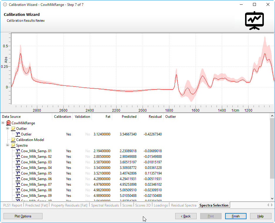 Die Spektrenauswahl zeigt ähnliche Informationen wie der Schritt 3 des Kalibrationsassistenten. Zusätzlich werden Spalten für die vorhergesagten Werte, Residuum und Ausreißer angezeigt.