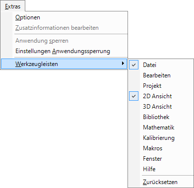 Die Werkzeugleiste enthält Symbole über die sich häufig verwendete Funktionen der Software direkt aufrufen lassen. Werkzeugleisten lassen und sich über das das Untermenü Werkzeugleisten im Menü Extras anpassen und zurücksetzen: