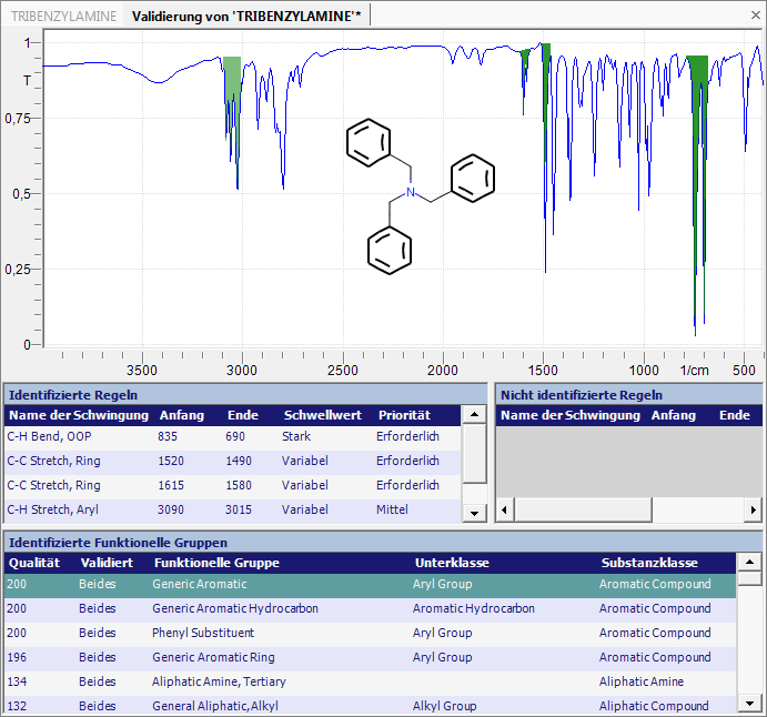Falls die Übereinstimmung nicht die erwarteten Ergebnisse liefert, kann die Validierung mit dem nächsten Molekül fortgeführt werden. Weiterhin können einzelne Peaks mit Hilfe des Browser für funktionelle Gruppen untersucht werden.