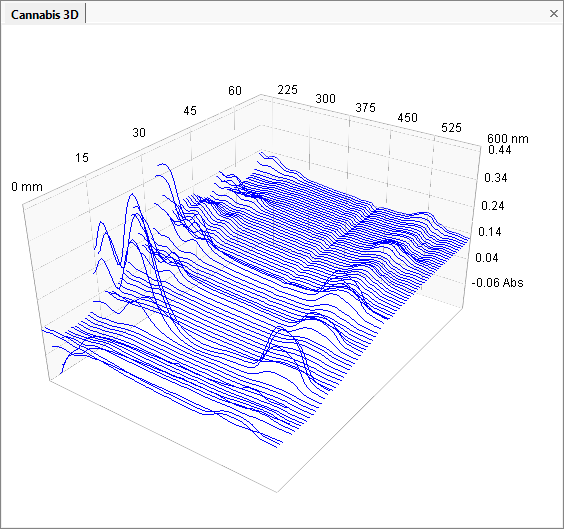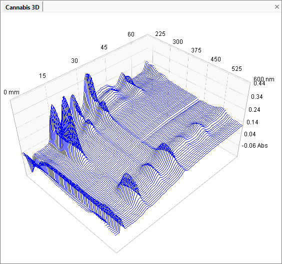 Die Wasserfall-Ansicht ist eine spezielle Variante der 3D-Datenansicht. Alle Optionen und Befehle der allgemeinen 3D-Ansicht können auch in der Wasserfall-Ansicht angewendet werden. Die Wasserfall-Ansicht stellt das 3D-Spektrum als Kombination von parallelen Linien entlang einer Achse dar. Diese Ansichtsvariante hebt die Kontur des Spektrenobjekts besonders hervor. Der Verlauf der Linien kann in Richtung der x-Achse oder y-Achse erfolgen. Der entsprechende Eintrag im Menü 3D-Ansicht ist unten dargestellt:
