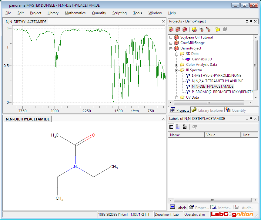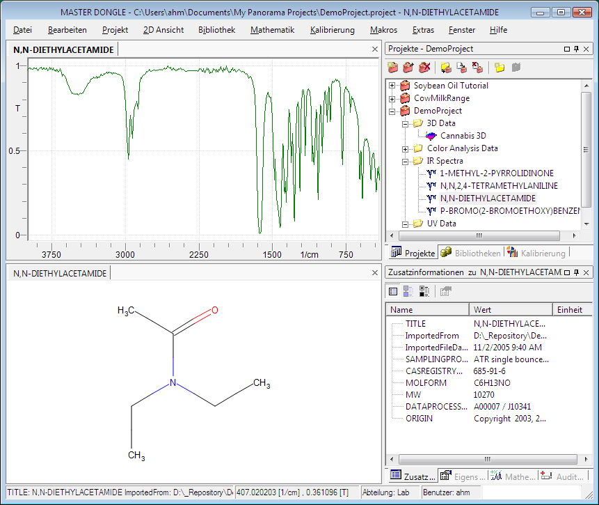 Der Arbeitsbereich stellt die primäre Arbeitsumgebung des Benutzers dar. Neben der Darstellung der analytischen Daten und Zusatzinformationen bietet der Arbeitsbereich alle für die Arbeit benötigten Werkzeuge. Folgende Optionen sind verfügbar: