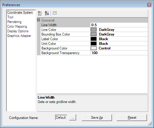 To save your personal 3D preferences, please click on the Save as button. Usually there is no need to explicitly save the preferences since all changes will automatically be saved when the dialog is closed. But if the user needs to often use different preferences he can save these by using the Save as button and specifying a configuration name.