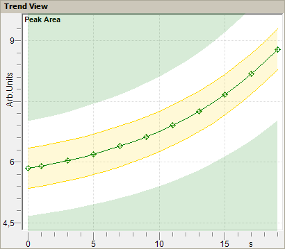 If this option is selected the data shape of the golden batch data will be displayed as colored region in the trend view. In the example above this is the yellow area. -