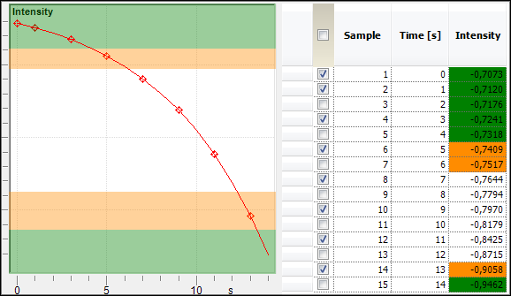 Limits are designed to add boundaries to the trend evaluation. If the trend values of the reaction run exceed a certain threshold which is defined by one or more limits, the corresponding samples can be easily separated from the regular data. All samples that exceed the limit threshold will be automatically classified as outliers. Outliers are easily distinguished visually in the trend view and property grid view by different coloring according to the limit settings. The outlier samples can also be saved separately. It is even possible to trigger external events if a limit is reached. An example with two limits is shown in the following screenshot: