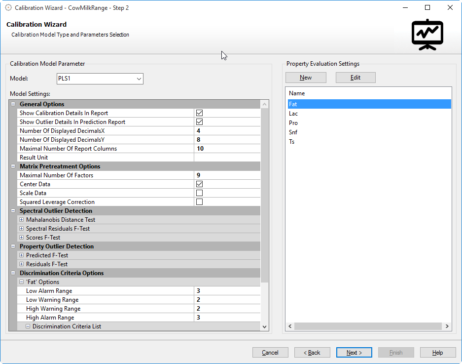 In case of a PCA calibration there are two different options to choose for the property evaluation settings and an additional Groups parameter will be available (see below):
