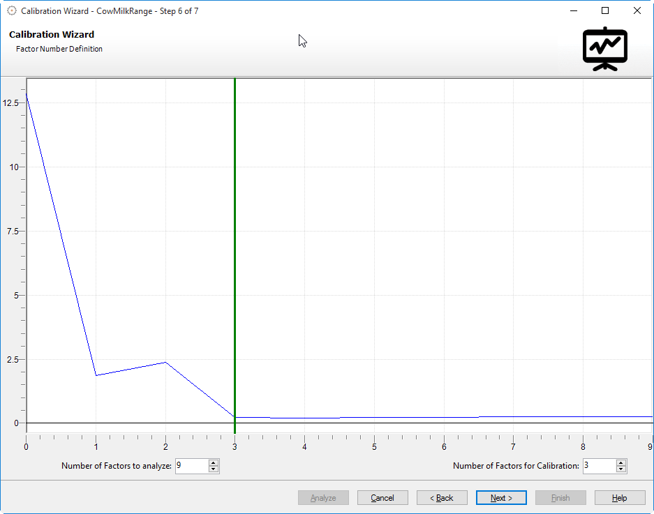 Within the wizard the software proposes a number of analyzed factors. This number can be accepted or may be changed interactively later by moving the vertical line or increasing / decreasing the values using the spin boxes.