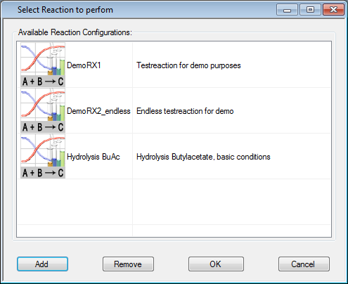 Select the command Configure Reactions from the Reaction Monitoring menu. The configure reactions dialog will be shown.