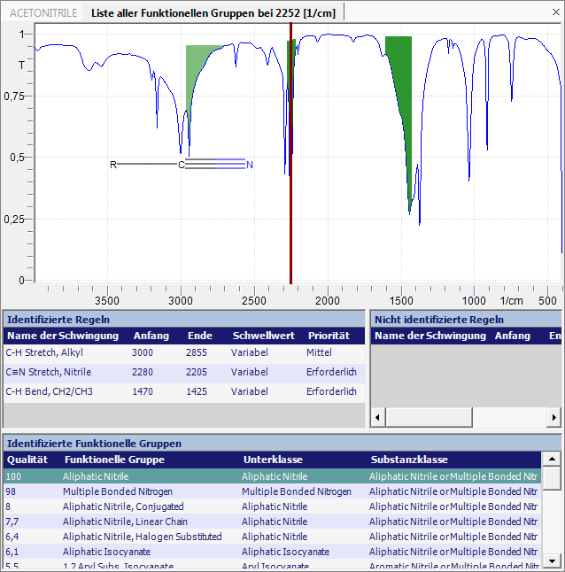 Additionally, a black vertical line marks the investigated frequency in the spectrum. The line can be moved with drag and drop to the frequency you are interested in. The list of suggested functional groups will be updated accordingly. The list is sorted by quality to provide the best match on top of the list.