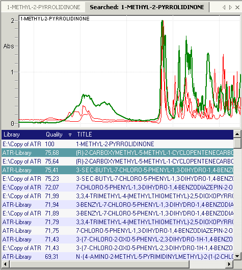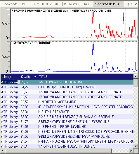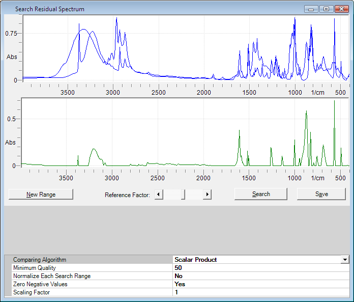 Analysis of substance mixtures is a difficult task for the analyst or spectroscopist. The software helps him to find suitable compounds contained in a mixture by spectrum search on custom or commercial libraries. Once the analyst has discovered and identified one of the substances included by comparing the spectrum of the mixture with spectra found in a library, further investigation of the "remaining" spectrum might be interesting. Therefore, the software offers the Search residual spectrum function: