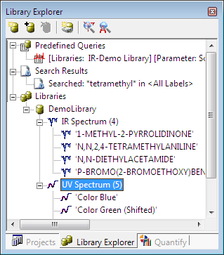 The library tree holds libraries and analytical data enclosed into libraries, predefined search queries and search results. -