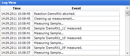 The log view is basically an activity log of the running reaction. It lists all events that occur during a reaction run. The log view window looks like this: