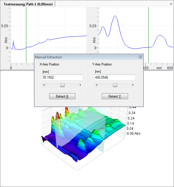 Manual data extraction is applicable to all 3D data objects. Particular x,z-planes or y,z-planes can be extracted at a user defined position. While moving through the 3D data object data point by data point, the position for extraction can be exactly determined.