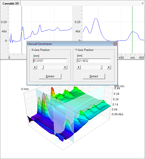 Manual data extraction is applicable to all 3D data objects. Particular x,z-planes or y,z-planes can be extracted at a user defined position. While moving through the 3D data object data point by data point, the position for extraction can be exactly determined.