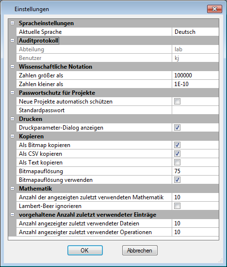 The name of the department is available here. The user will be asked to enter the department name in the User Authentication Dialog during the very first start of the software. This can be any company name or name of a division or department in a company. This value should also reflect the function or position of the user. Unlike the operator name, the department name can be changed later on in the options dialog.