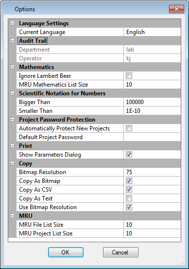 Some common application settings may be adjusted in this dialog. The dialog looks like this: