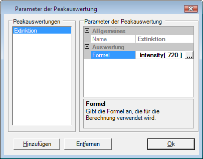 Peak Evaluation is applied to show additional user defined calculation results together with the peak table of a data object. Calculation results are derived from any peak data of a spectrum. Please refer to the "Peak Evaluation" section in the chapter "Mathematics" for details.