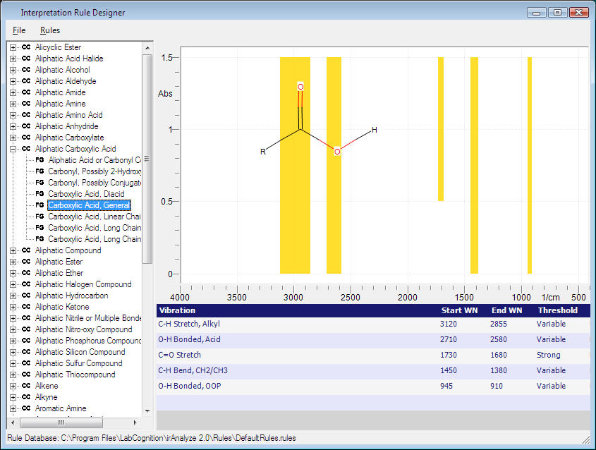 A basic set of interpretation rules and corresponding hierarchy is provided with the installation of the software. You may modify, add or remove functional groups and molecules yourself to improve and adapt the rule database to your personal requirements. For this purpose, the following options are available:
