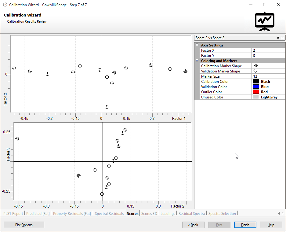 In case of a PCA calibration the score plot gives a convenient overview of the qualitative results of the calibration. A good result will show all samples assigned to one of the predefined groups ( see Calibration Model Wizard - Step2 ) and the groups itself will be clearly separated.