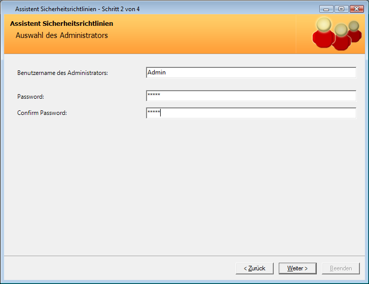 After selecting the security policy an administrator user needs to be chosen. The administrator is always the first user that will be added to the user management and he will perform all further user management and security configuration steps. Using the administrator account for regular operation of the software is not recommended, it is intended for user management and security setup purposes only!
