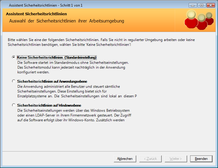 The Software Security Wizard guides the user in setting up the software security policy and in assigning an administrator user. Using this security policy all users will be managed by the application itself.