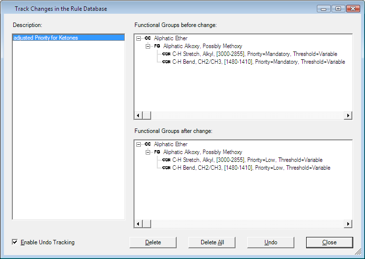Those users, who develop new rule data bases or modify existing ones in order to improve analysis results, always need to test their changes before the rule data base can be applied in routine IR interpretation. After some modifications it would be a difficult approach to keep all recent changes in the rule data base in mind and also concentrate on the IR interpretation results. The software offers a convenient system which tracks all changes to assist the user during optimization. Recent changes will be logged and can be undone stepwise up to a certain amount. The system needs to be activated manually in the software.