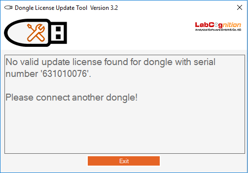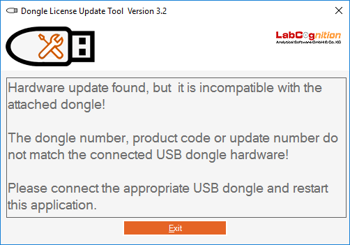 The USB-Dongle hardware configuration update has already been installed by the update tool in a previous run. It can only be installed once! After successful installation it automatically becomes incompatible with your USB-Dongle.